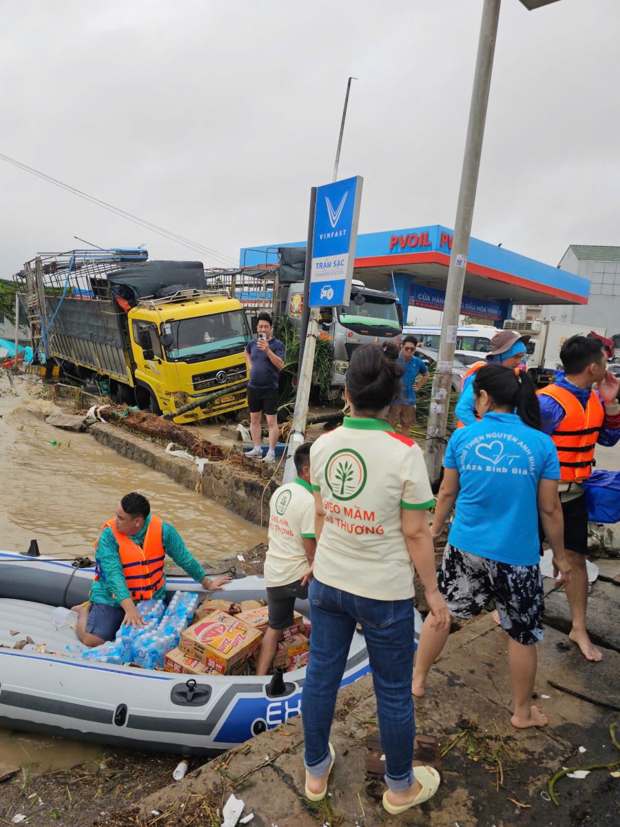 Đường chia cắt. Đoàn kẹt lại ở Sông Cầu suốt nhiều giờ. Người dân địa phương hỗ trợ chúng tôi dừng trú an toàn, ấm lòng vô cùng. 4 giờ sáng, khi nước bắt đầu rút, một số anh em trong đoàn đã đi gõ từng cửa xe phía trước để đánh thức tài xế, điều phối để mở đường cho cả tuyến dài phía sau. Đến An Phú (Phú Yên), nước dâng cao 3 mét. May mắn thay, đoàn được dừng tại khu đất cao cạnh hồ nước và Tịnh Xá Ngọc Bửu. Các thầy cho mọi người vào rửa ráy, trú tạm và trò chuyện để vơi đi lo lắng. Đêm ấy ngồi trên xe, nghe tiếng xe cứu thương hú xuyên màn mưa, ai cũng thắt lòng – lo cho bà con và cũng lo cho sự an toàn của chính mình.